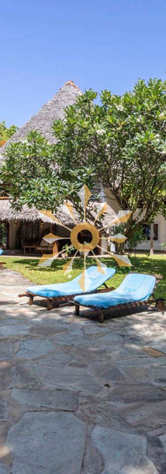 Designed with a soaring “makuti” roof and thoughtfully furnished, the villa provides a warm and inviting atmosphere, ideal for relaxation and rejuvenation. The villa accommodates up to twelve guests in six well-appointed double or twin en-suite bedrooms, with four upstairs rooms opening onto private shady balconies. Each bedroom has mosquito nets, ceiling fans and ample wardrobe space, ensuring comfort and privacy. The interiors include a spacious reception room with elegant sitting areas and a bar, a dining room that opens onto the rear garden with a 12 seater dining table and a front veranda perfect for breakfasts and lunches with views towards the Indian Ocean.